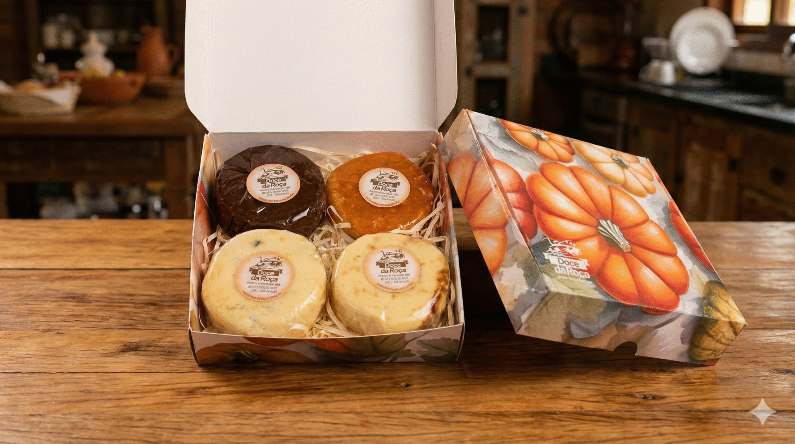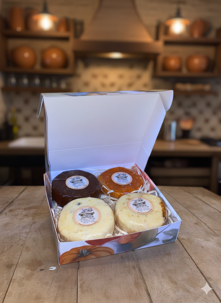 Tudo arrumadinho numa caixinha temática cheia de detalhes da vida simples da roça. É presente, lembrança, mimo e vontade de provar tudo de uma vez só.
